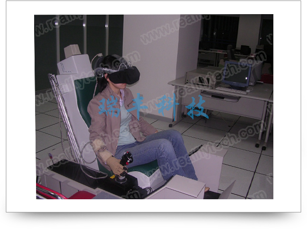 图中的虚拟座舱是本实验室的第二代虚拟座舱系统,从2003年起开始研发。同第一代产品相比,第二代座舱系统除了具有仿真座舱座椅以外,随着硬件性能的提高,头盔显示器的分辨率提升为1024 X 768,数据手套添加了触觉反馈,系统的视觉效果,操控性,虚拟作舱内的交互,仪表的真实感都达到了相当的水准。通过采用头盔式显示器 (Head Mount Display,HMD) 和数据手套 (Data Glove) 取代常规飞行模拟器的实物座舱及操纵机构,使虚拟座舱系统在座舱布局结构以及仿真显示功能上具有较强的柔性。在硬件结构不变的情况下,通过改变软件及数据库就可适应不同机种或不同仿真功能的仿真任务。同时虚拟座舱的价格比常规模拟器要低的多。经过多年的深入研究和多种工程应用实践,证明此项技术属于成熟技术,已经应用于多个项目中。